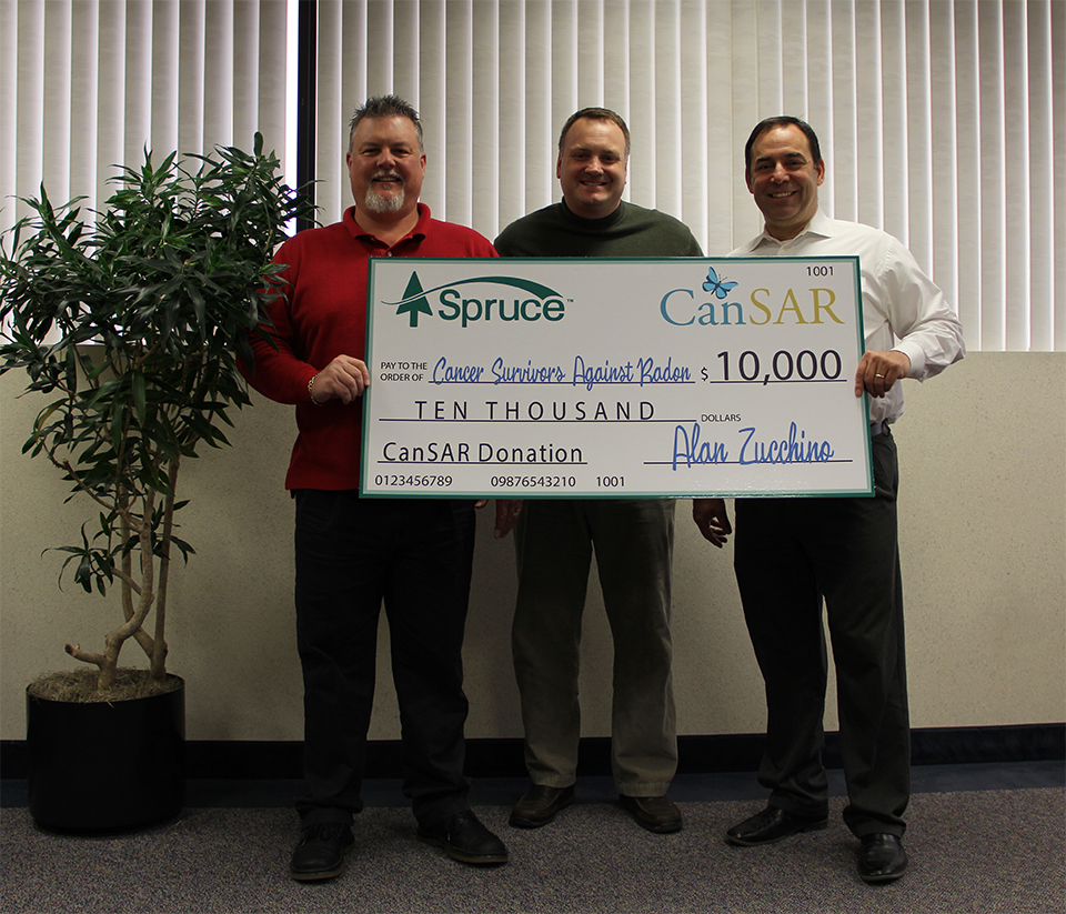 Ward Hill, MA, March 8, 2016 (Newswire.com) - Just last week, executives from Spruce Environmental Technologies, Inc. presented Cancer Survivors Against Radon (CanSAR) President, Kyle Hoylman, with a check for $10,000. The company’s call for donations to CanSAR began in mid-January of this year in conjunction with National Radon Action Month. Spruce asked each of its customers to add $5.00 onto their product orders through February with the promise of matching the total, dollar for dollar, with the goal of significantly benefitting this life-saving organization.