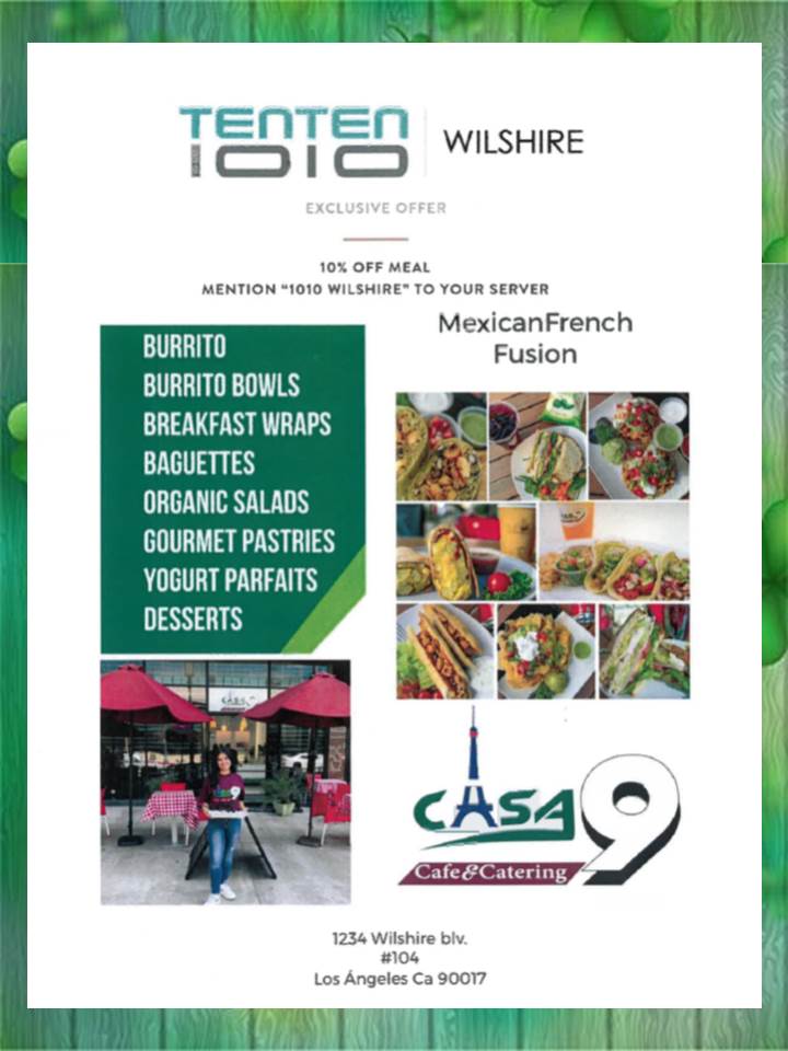 LOS ANGELES, March 22, 2019 (Newswire.com) - 1010 Wilshire has an exclusive offer for residents who dine at Casa9 Café and Catering. 1010 Wilshire residents will receive a 10 percent discount when they mention "1010 Wilshire" to their server. Casa9 Café and Catering is a Mexican French Fusion eatery that serves a variety of delicious foods including burritos, burrito bowls, organic salads, gourmet pastries and breakfast wraps. Casa9 Café and Catering is located at 1234 Wilshire Blvd., #104, Los Angeles, California.