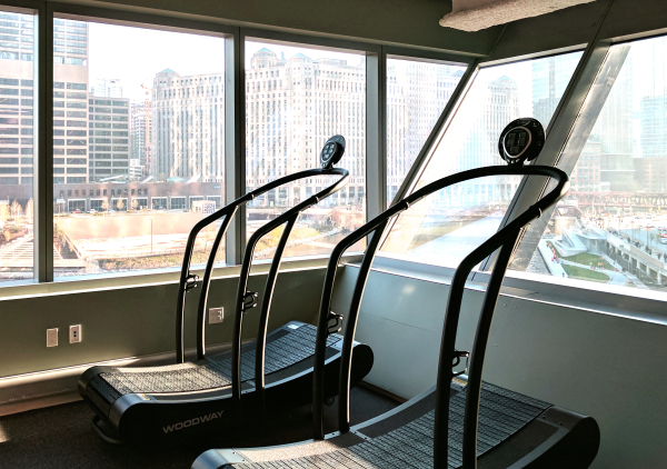 The fitness center at 150 N Riverside includes state of the art Precor Preva cardio equipment, which provides a fully connected cardio experience including integrated TV’s and computers, Woodway curve treadmills, a full assortment of strength equipment, a large group exercise studio, LifeFitness Synergy functional training equipment, MyZone training systems, and a dedicated free weight area. The center also boasts well-appointed locker rooms and amenities, and provides its tenants with a range of services including laundry, private lockers, personal training and a diverse group exercise curriculum.