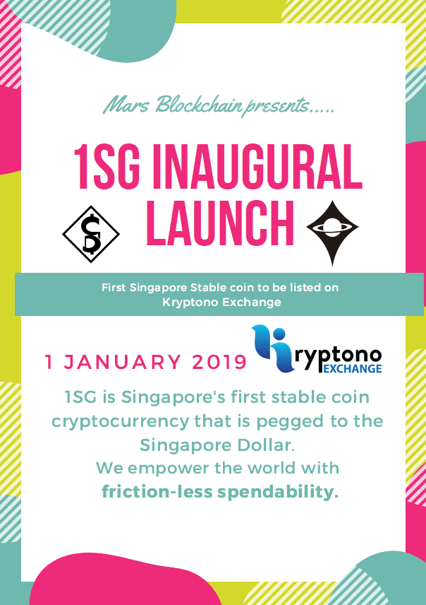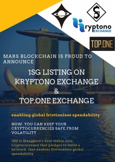 Mars Blockchain is pleased to announce the launch of its very first stablecoin, 1SG, on the most prominent crypto exchanges in the world – Kryptono Exchange & Top.one Exchange. The fiat-collateralised stablecoin will be available for trading on the platforms from 1 January 2019 onwards.