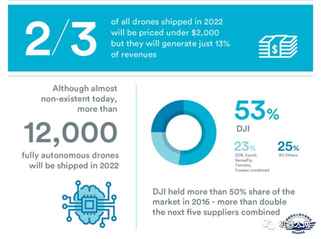 At present, the lower threshold of the UAV (usually refers to the price of less than 2,000 US dollars, or 13,000 yuan) dominated the UAV market, by 2022, they will occupy the global UAV shipments of two-thirds; But interestingly, five years later they expect only 13% of the gross revenue of the UAV market, as UAVs are moving towards "industrial" transformation. In the autonomous unmanned unmanned aerial vehicle, current (2017), its shipments are almost zero, negligible, but by 2022, it will be completely another scene - to achieve full free flight Man-machine shipments will exceed 12,000 units. These all-in-one unmanned aerial vehicles do not require any man-made operations throughout the mission, and they will begin to appear in large quantities in the UAV market by 2020. The reason is a small part is driven by technological development, but the main reason is the consumer awareness of the rise and unmanned aerial vehicle regulatory mechanism is mature and sound, making the independent UAV ushered in the development of the mature period.