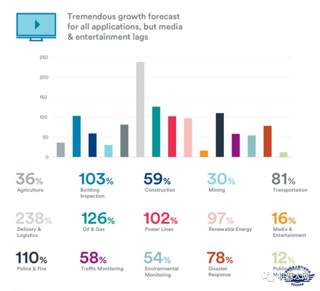 The next five years, UAV applications in the following 15 industries and areas will increase significantly (as shown above): agriculture, housing testing, construction, mining, transportation, logistics, oil and gas, power lines, renewable energy, media and entertainment, police and fire, traffic monitoring, environmental monitoring, disaster response, public land management. Among them, the logistics industry, oil and natural gas, as well as police and fire,, three areas of the fastest growing, respectively, to 238%, 126% and 110%. In addition, although the current unmanned aerial vehicles in the field of media and entertainment, the most widely used, but by 2022, its development speed was clearly catching up in other areas, is expected to increase its annual rate of only 16%.