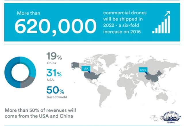 With the commercial UAV penetration rate increased significantly, its shipments will also increase significantly. By 2022, commercial unmanned aircraft shipments will exceed 620,000, six times in 2016. China and the United States, the business of two major sales of unmanned aerial vehicles, by 2022, the two countries of the commercial UAV industry market value will account for the global commercial UAV industry market value of more than 50% (of which China accounted for 19 %, The United States accounted for 31%).