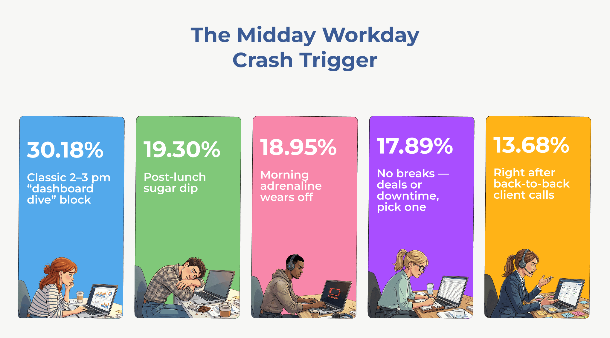 Everyone jokes about the "afternoon slump" - that post-lunch zombie mode where motivation evaporates. Blame the turkey sandwich? Nah, our survey pins the culprit: 30.18% blame the "dashboard dive." That's the brutal transition from morning mayhem - endless pings, fire-drill tasks, back-to-back meetings - to finally tackling deep, focused work, only to crash spectacularly.