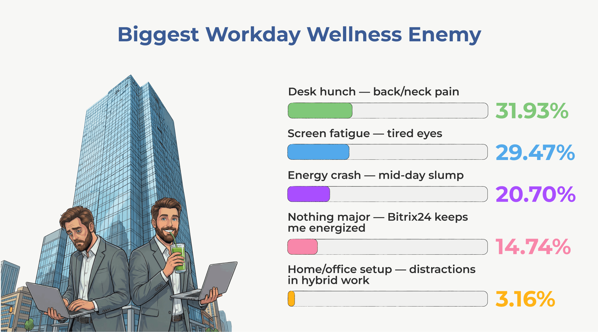 Our survey posed a straightforward question to 1,000+ Bitrix24 users: "What's your top wellness roadblock during working hours?" The responses paint a vivid picture of a body under siege - not from marathons or heavy lifting, but from the subtle tyrants of screens, sedentary seats, and endless digital overload.