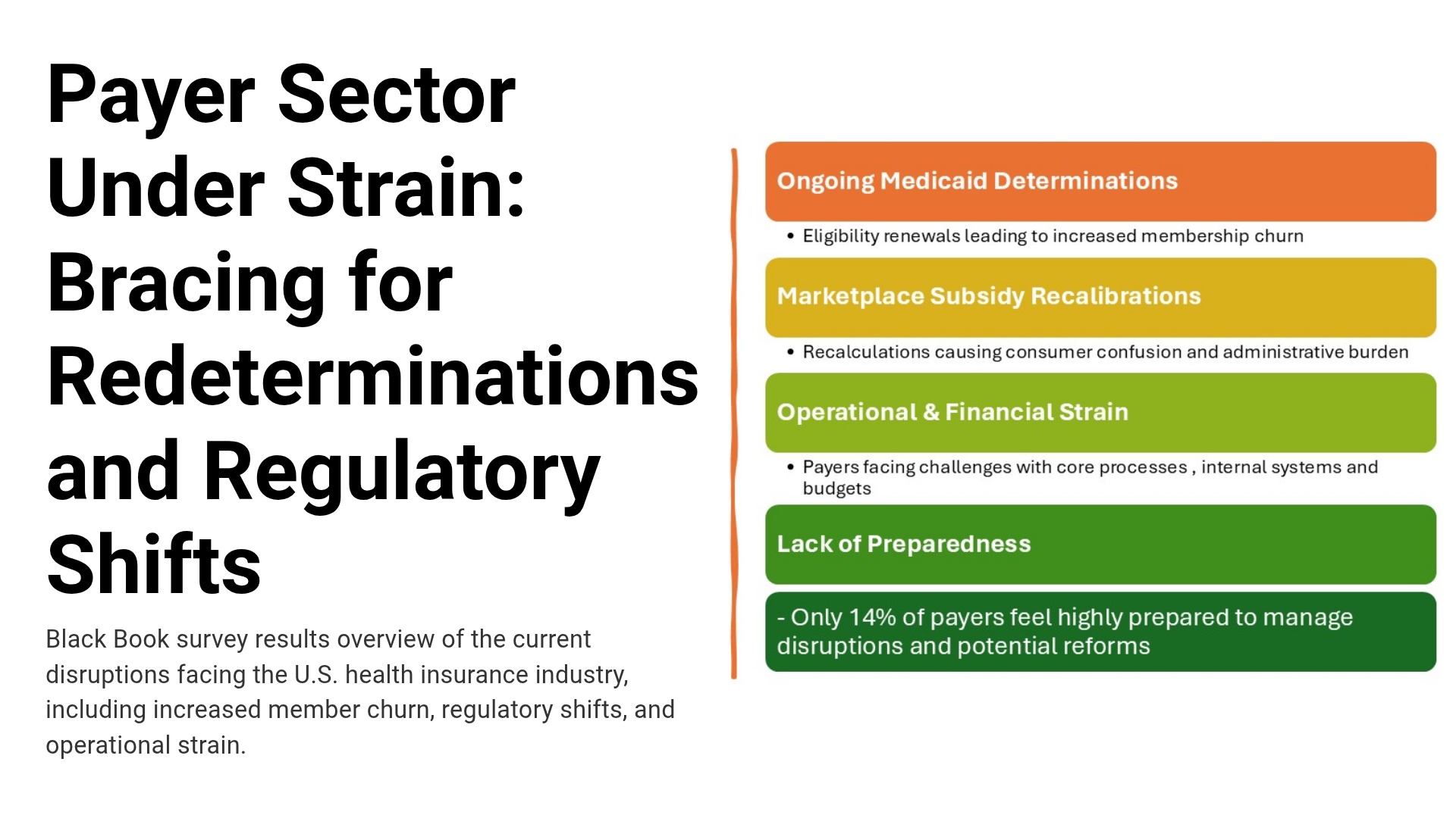 WASHINGTON, DC, August 27, 2025 (Newswire.com) - U.S. health insurers are already feeling the ripple effects of ongoing Medicaid redeterminations and Marketplace subsidy recalibrations, according to new research from Black Book™. Findings point to escalating operational and financial strain across payer organizations well before additional reforms under consideration in Washington become law.