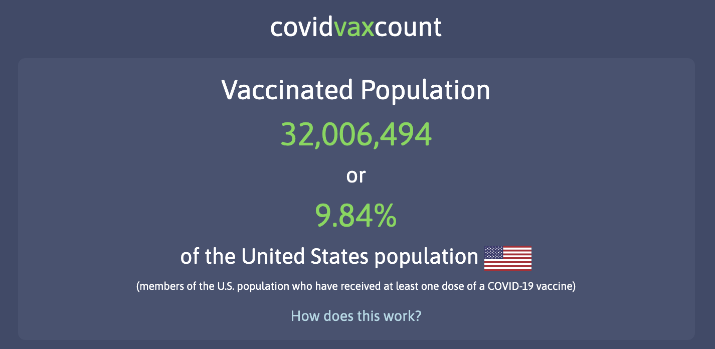 NEW YORK, February 8, 2021 (Newswire.com) - As of today, 10% of Americans have received at least one dose of a COVID-19 vaccine according to a new vaccine tracker, covidvaxcount.live. According to the site, which pulls data from the CDC, Johns Hopkins, and individual states; over 33 million Americans have received at least one dose of a COVID-19 vaccine.