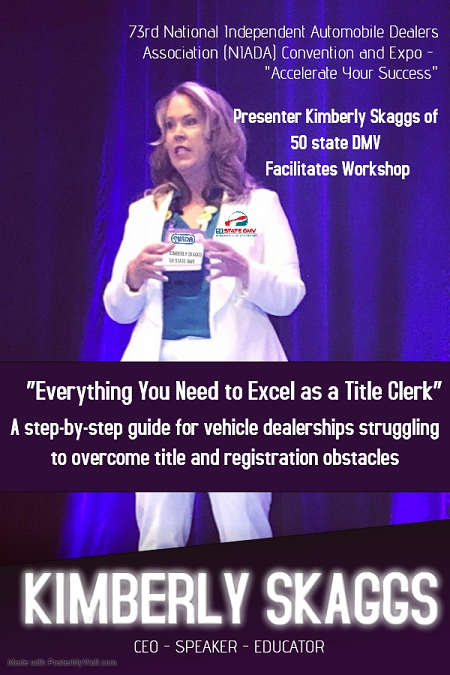 Skaggs conducted a classroom style presentation titled “Everything You Need to Excel as a Title Clerk,” based on her book “Vehicle Title Clerk Master Course: Everything You Need to Excel as A Title Clerk,” a step-by-step guide for vehicle dealerships struggling to overcome title and registration obstacles. The session received a five-star rating, and attendees received a copy of the book. View the original video announcing the breakout session by Kimberly Skaggs.