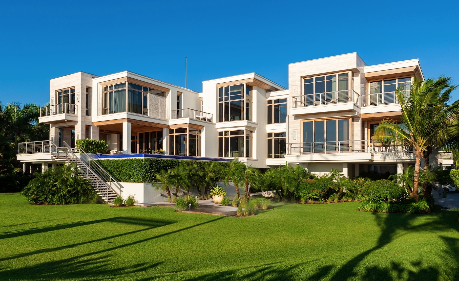 Designed by Randall Stofft and John Cooney of Stofft Cooney Architects and masterfully crafted by Dave Rogers of Newbury North Associates Inc., in collaboration with Jeffrey Strasser from Marc-Michaels Interior Design, the furnished six-bedroom estate encompasses over 16,000 square feet. Encapsulating modern sophistication, cutting-edge design and meticulous attention to detail, its stylishly appointed interior employs the finest materials amid elegant architectural elements and portrays the sense of a warm and comfortable beach house. An oversized stairway leads into an array of exceptionally curated spaces including a dining room with two adjacent square dining tables, built-in glass wine room and grand piano. An all-glass hallway lines the south wing featuring a club room and guest suite with private living area. A gourmet kitchen is highlighted by an expansive island, built-in cabinetry and second kitchen/pantry that seamlessly flows into the family room, balcony and pool. The game room is complete with media area, conversational area with four club chairs and multiple balconies while a bar boasts custom finishes for effortless entertaining.