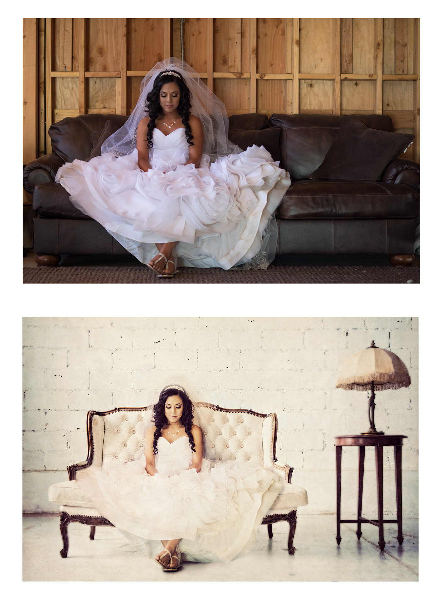 The final result was simply, "WOW". The location's "unfinished basement look" was transformed into an creamy urban-meets-contemporary chic living room and a photo that would give any bride the chills.