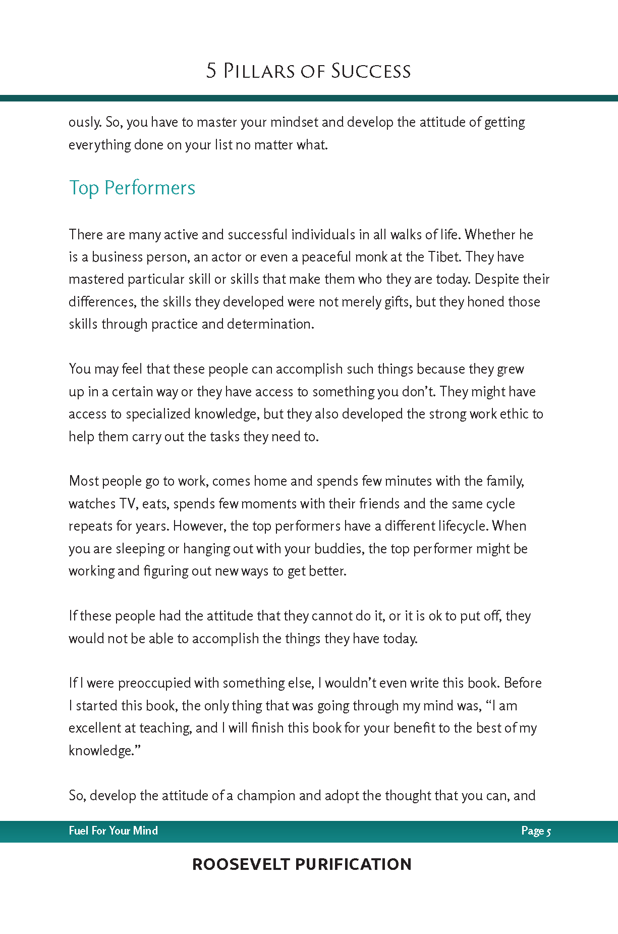 5 Pillars of Success is a self-help book that focuses on five critical areas of life. They are the conscious mind, ability to take massive action, ability to double one's productivity, ability to manage goals and the ability to take care of one's health. In each area, the author shares his knowledge and wisdom from his personal experience and also the knowledge he acquired after researching the most successful people around him. Each of his findings aims to help cultivate a bright future and help people become more successful in all areas of their life.