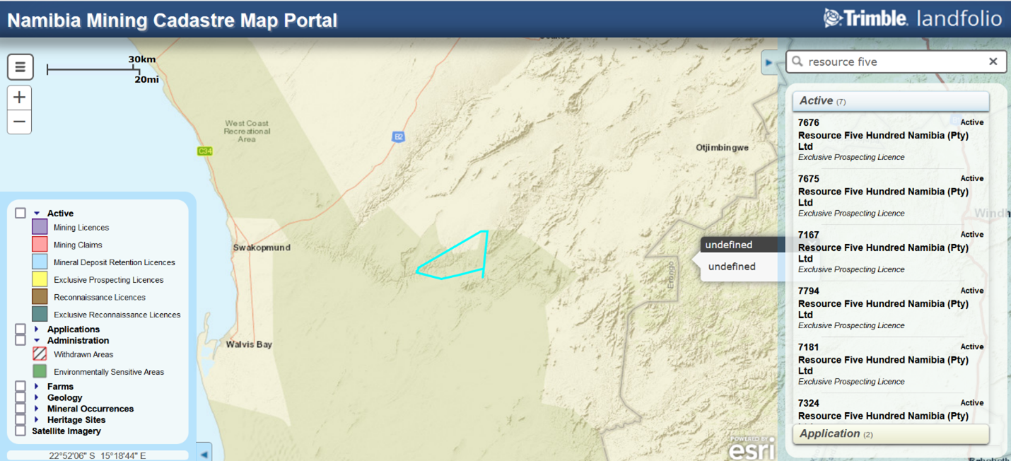 Ubique Minerals Limited ("Ubique", or the "Company") intends to purchase up to 1,752 shares in Resource 500 V Limited, which owns mineral exploration rights in Namibia through its subsidiary 95% owned Resource Five Hundred. The remaining 5% of Resource Five Hundred is held by Namibian nationals. Prior to the Proposed Acquisition Ubique owns 533 shares in R500 and after the Proposed Acquisition Ubique will own a minimum of 99.66% of the outstanding R500 shares. As of 26th August 2024 99.66% of the sellers have signed the binding SPA and closing is expected to occur on or before 20th September 2024.
