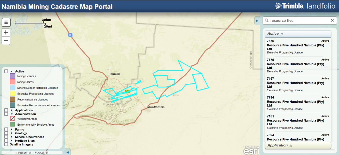 R500 has acquired exploration Licenses ("EPLs") in the Otavi Mountain Land of northern Namibia, largely covering similar geology to that which hosts the most prolific base metal mines in the history of Namibia. They include Tsumeb and Kombat. Tsumeb operated for over 100 years and produced very high-grade ore of copper, zinc, lead and cadmium. Other deposits in the area that have been mined included vanadium in the mix of metals extracted. Although Tsumeb has been mined out the smelter and surface plant are still operated as a custom processing plant. Kombat has recently been re-opened by a Canadian company, Trigon Metals Inc. Tsumeb lifetime production is at least 20 million tonnes with a grade of >5% copper, 10% lead, 3% zinc and several ounces per tonne of silver. At various times additional minerals recovered including germanium and gallium. Tsumeb ore reserves at the end of 1991 were stated as 1,065,000 tonnes grading 5.78% copper, 3.50% lead and 179 grams per tonne silver.