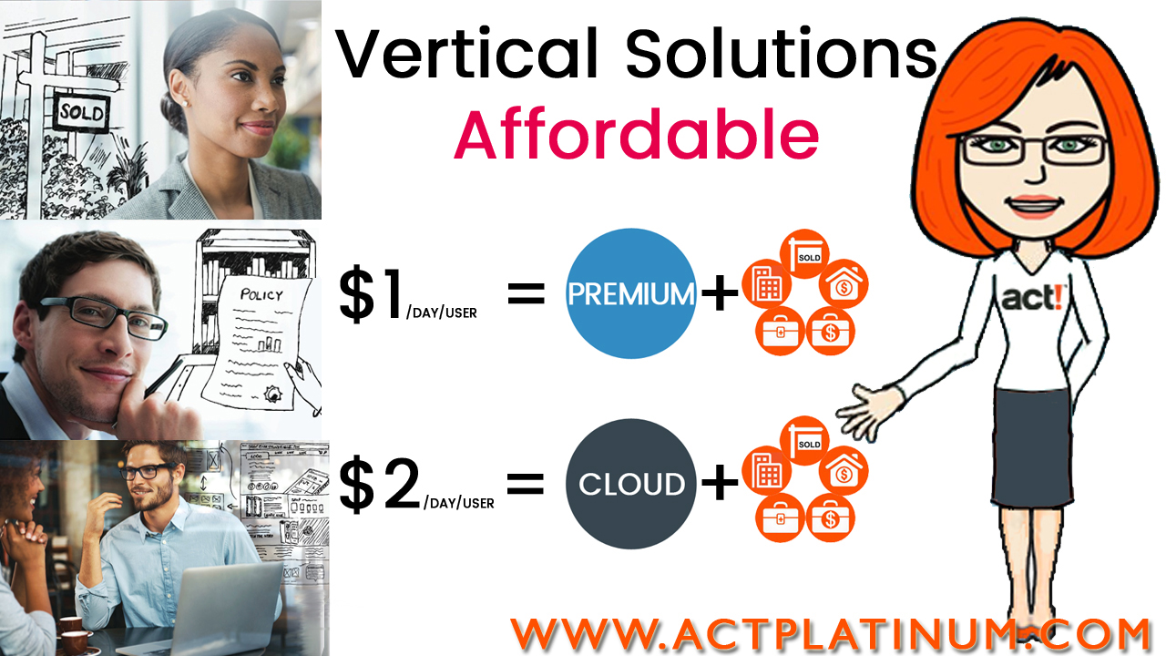 Our vertical solutions for Act! CRM are affordable. For around a dollar a day, per user, you can have an Act! Premium subscription with a vertical solution. And for less than 2 dollars a day, per user you can have Act! Cloud hosting with a vertical solution.