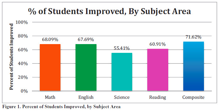 "Rigorous aggregate level t-tests in which pre- to post- score changes were assessed demonstrated that three of the four subject areas and the composite average saw statistically significant positive score changes at the critical p-value of .05. The only non-significant result was for Science. This threshold effectively gives us 95% confidence that the results observed in this sample would generalize to the population of interest (i.e., all High School Juniors)," said Dr. Jake Hoskins of h-squared Analytics, LLC. The research concluded that similar rates of improvement are shared among students from different genders, ethnicities and school quality.