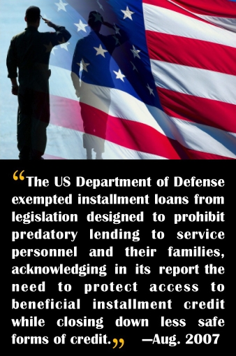 In 2007 the US Department of Defense exempted installment loans from legislation designed to prohibit predatory lending to service personnel and their families, acknowledging in its report the need to protect access to beneficial installment credit while closing down less safe forms of credit.