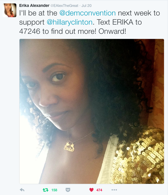 Alexander announced her DNC participation through twitter @ealexthegreat : "I'll be at the @DemConvention next week to support @Hillary Clinton. Text ERIKA to 47246 to find out more."