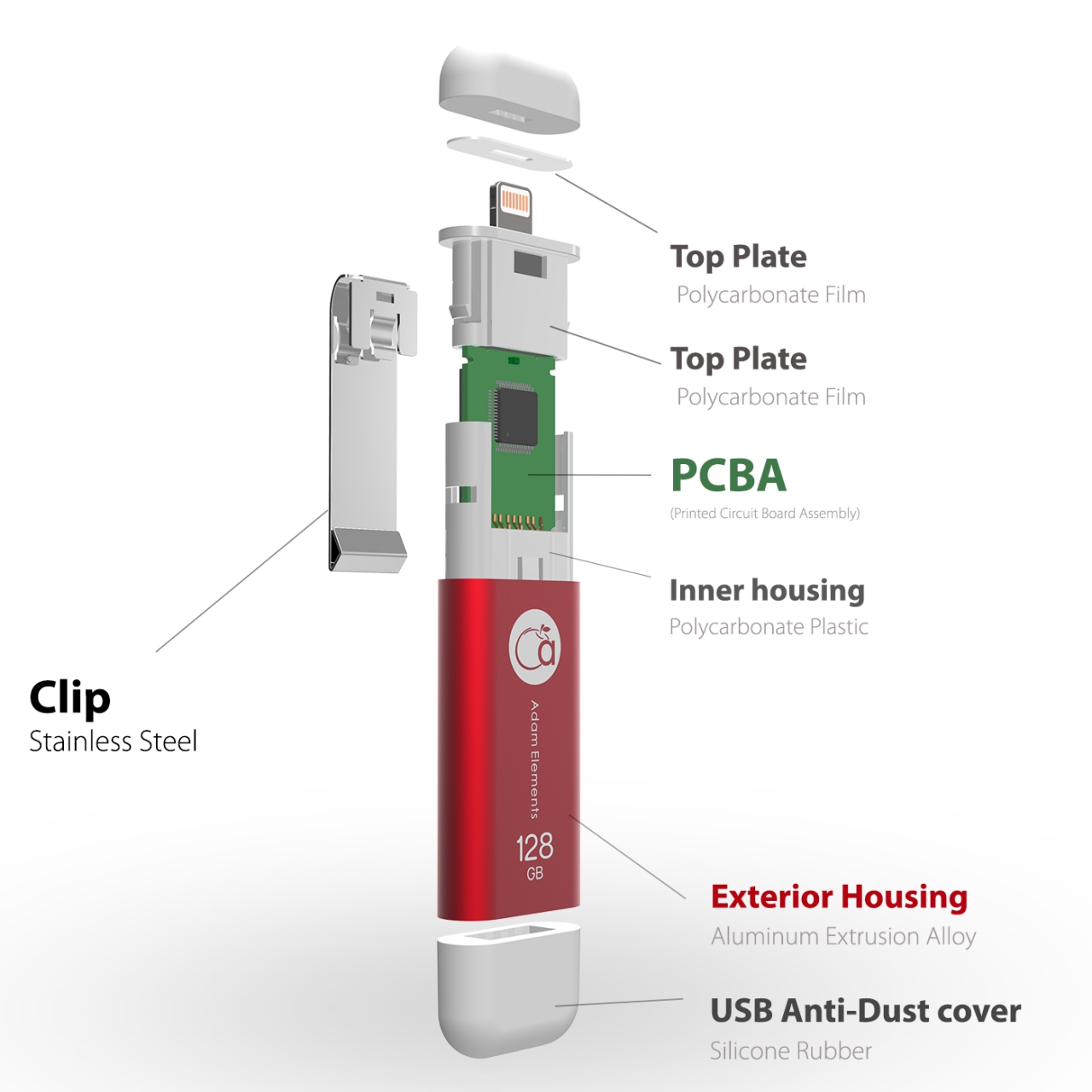 In terms of product development, the main objective of Adam Elements is to enable users to enjoy newer, better, and more convenient smart and mobile lifestyles. What makes iKlips especially innovative is that it not only provides iPhone and iPad users with an unprecedented method for quickly and easily backing up and sharing data, but also represents a smart solution for expanding storage space of iOS devices. iKlips consists of a dual-interface integrated design with full Apple Lightning and USB 3.0 functionality, enabling users to enjoy faster, hassle-free data transfers and sharing between iOS and other computer systems with just a single flash drive. iKlips is the ultimate mobile storage solution for everyday use at home, the office, and for enjoying the latest multimedia entertainment. In addition, Adam Elements' commitment to only use high quality MLC components makes the iKlips deliver the world's fastest Lightning flash drive read/write speeds and the most stable and long-lasting storage quality and performance.