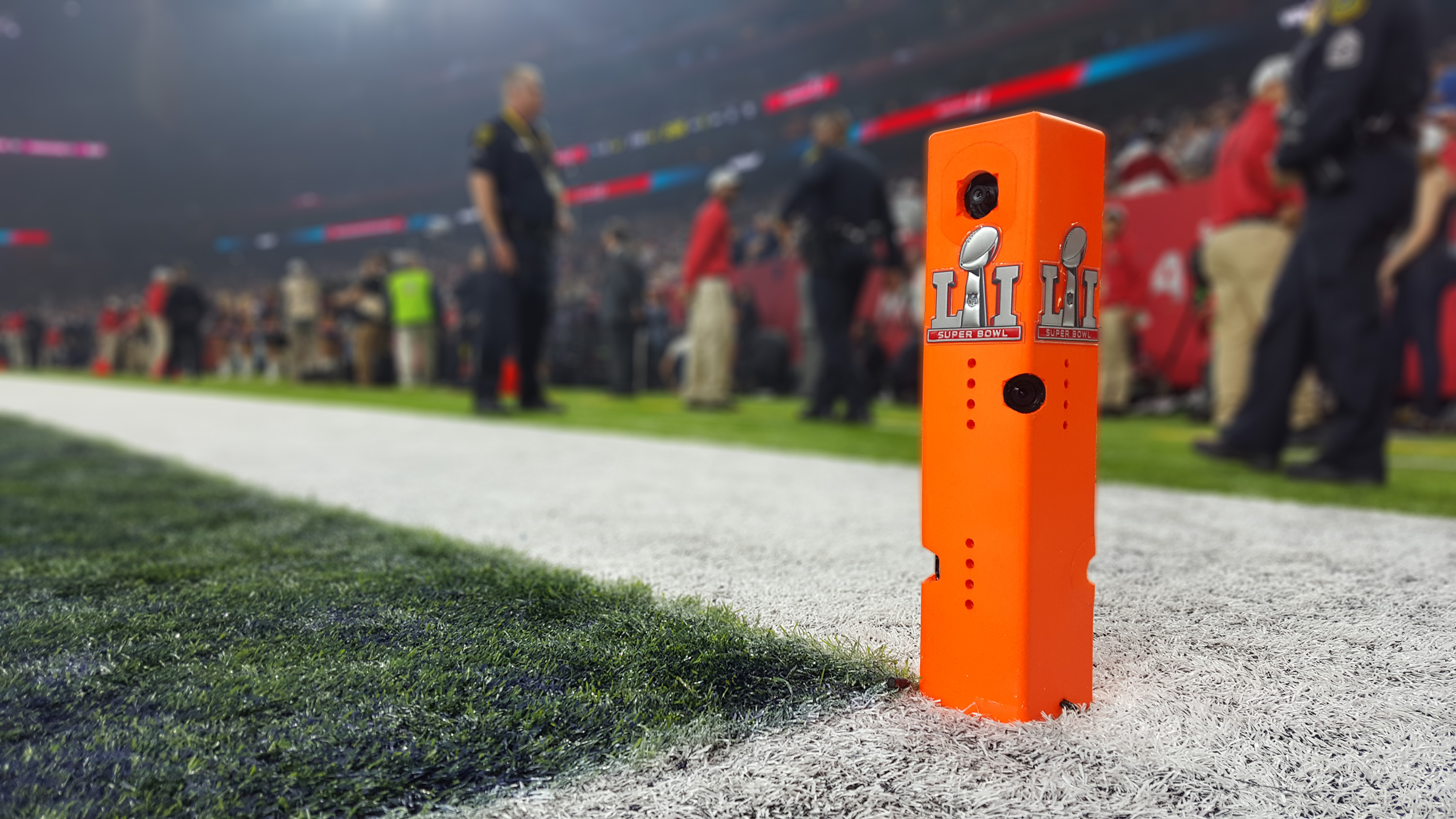 PylonCam 2.0™ offers a new look at the playing field as seen from the pylon. By moving the orientation of two lenses to the corners of the pylon, each of these cameras is able to cover both the goal line and the sideline. This innovative design allows the third camera to shoot a much tighter field of view down the goal line. Super Bowl LI had a record-high 24 cameras deployed inside the pylons.