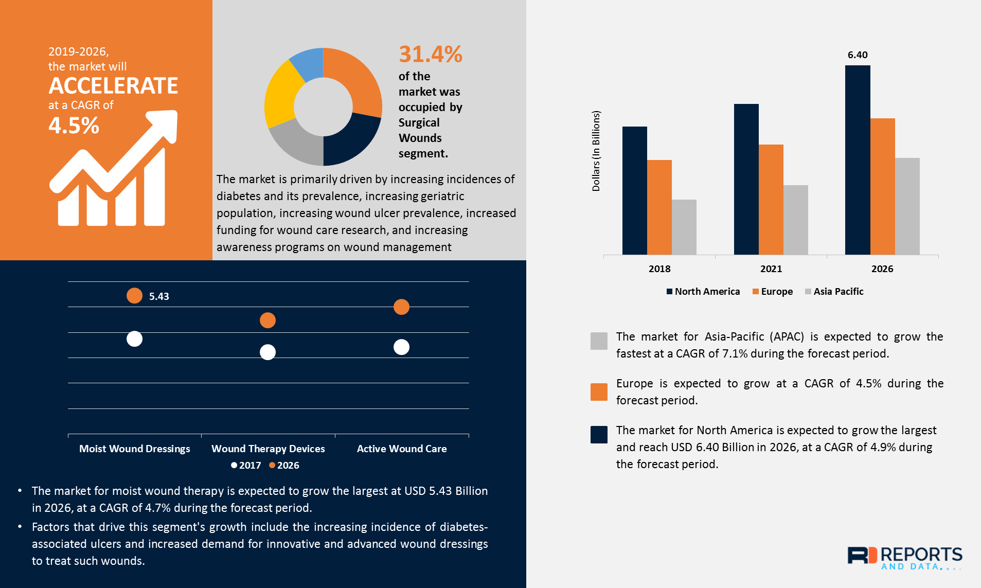 - The market for North America is expected to grow the largest and reach USD $6.40 billion in 2026 at a CAGR of 4.9% during the forecast period. The regional demand will be driven by the high and rising prevalence of chronic and acute wounds and an increasing number of surgeries. In addition, high awareness and adoption of advanced wound care devices, such as negative-pressure wound therapy (NPWT), in the coming years will increase regional growth.