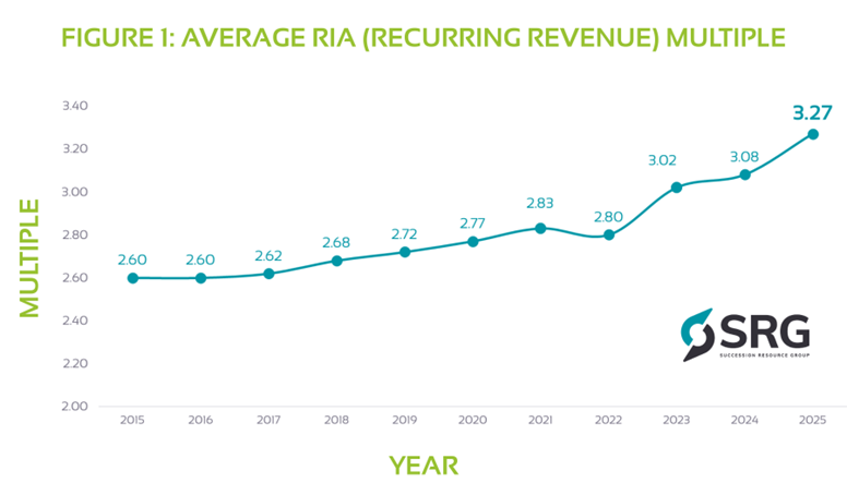 Based on current "rules of thumb" for benchmarking purposes, the average EBITDA multiple for advisory ‘businesses' in 2025 rose to 9.98x while the average topline recurring revenue multiple for ‘books of business' climbed to 3.27x.