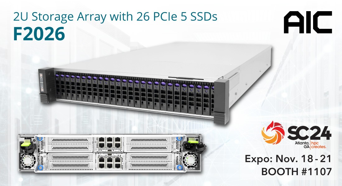 MILPITAS, Calif., November 20, 2024 (Newswire.com) - As global electricity demand from AI and data centers is projected to surge by 75% between 2022 and 2026, the need for more efficient solutions is urgent.(1) In response, AIC Inc. and ScaleFlux proudly unveil a breakthrough storage solution designed to meet the demands of AI and machine learning workloads. The F2026 Inference AI server is a 2U Just-a-Bunch-of-Flash (JBOF) array featuring dual NVIDIA BlueField-3 data processing units (DPUs) and 26 high-performance ScaleFlux CSD5000 drives.
