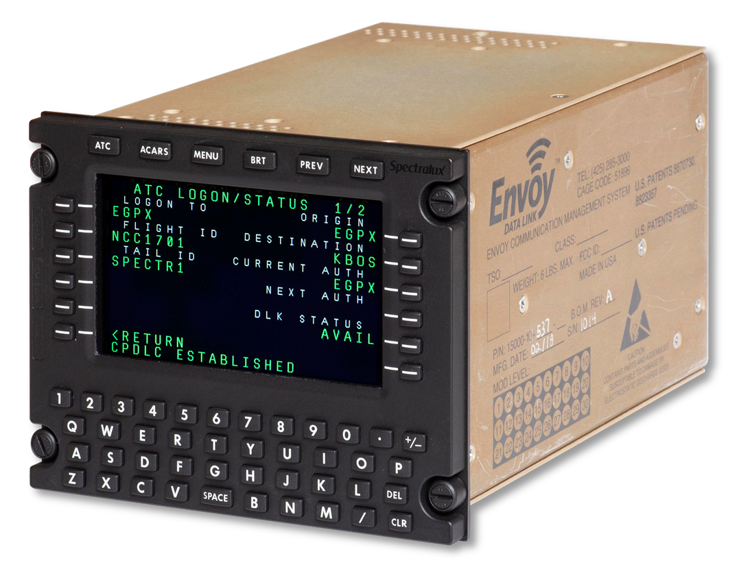Targeting initial entry into service in early 2022, the Spectralux Envoy features three separate avionics modules in a single, All-In-One certified unit. These include a Communications Management Unit (CMU), a VHF Data Radio (VDR), and a Multi-function Control and Display Unit (MCDU). In addition, Envoy uses a bi-directional A739 interface allowing it to display and control a separate avionics module, and can be displayed and controlled by a separate MCDU. In 2020, Spectralux announced FAA approval of Envoy to TSO-C113 Airborne Multipurpose Electronic Displays and TSO-C160 Very High Frequency (VHF) Digital Link (VDL) Mode 2 Communications Equipment.