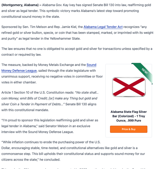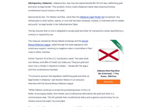 MONTGOMERY, Ala., April 11, 2025 (Newswire.com) - Alabama Gov. Kay Ivey has signed Senate Bill 130 into law, reaffirming gold and silver as legal tender. This symbolic victory marks Alabama's latest step toward promoting constitutional sound money in the state.