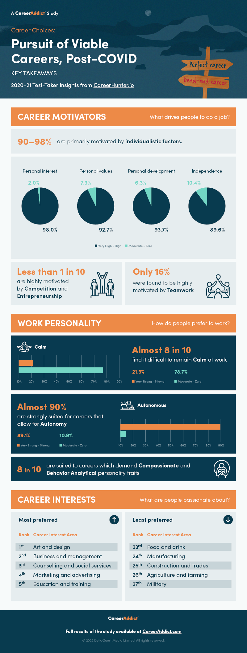 NEW YORK, February 22, 2022 (Newswire.com) - CareerAddict, one of the world's leading online career resources, has accumulated data in its most recent study suggesting that 80% of workers find it difficult to remain calm under pressure in the workplace post-pandemic. The study, "Pursuit of Viable Careers, Post-COVID," collected insights through CareerAddict's career testing platform, CareerHunter.io. The study's findings were analyzed by the CareerAddict team throughout 2020 and 2021.