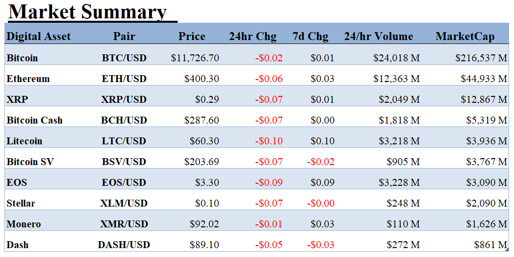 NEW YORK, NY, August 19, 2020 (Newswire.com) - ALT 5 Sigma Inc. an emerging leader in blockchain powered financial platforms provides its daily digital instruments market summary for Bitcoin (BTC/USD), Ether (ETH/USD), Litecoin (LTC/USD).