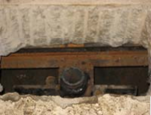 Ram Jack installed hydraulically driven piles both inside and outside of the building at an average depth of 40’-45’, using guide sleeves to help relieve lateral forces. In addition, since the floor slab lacked necessary support to bridge the gap between the load-bearing walls, a wide flange steel beam was welded to the pile bracket.