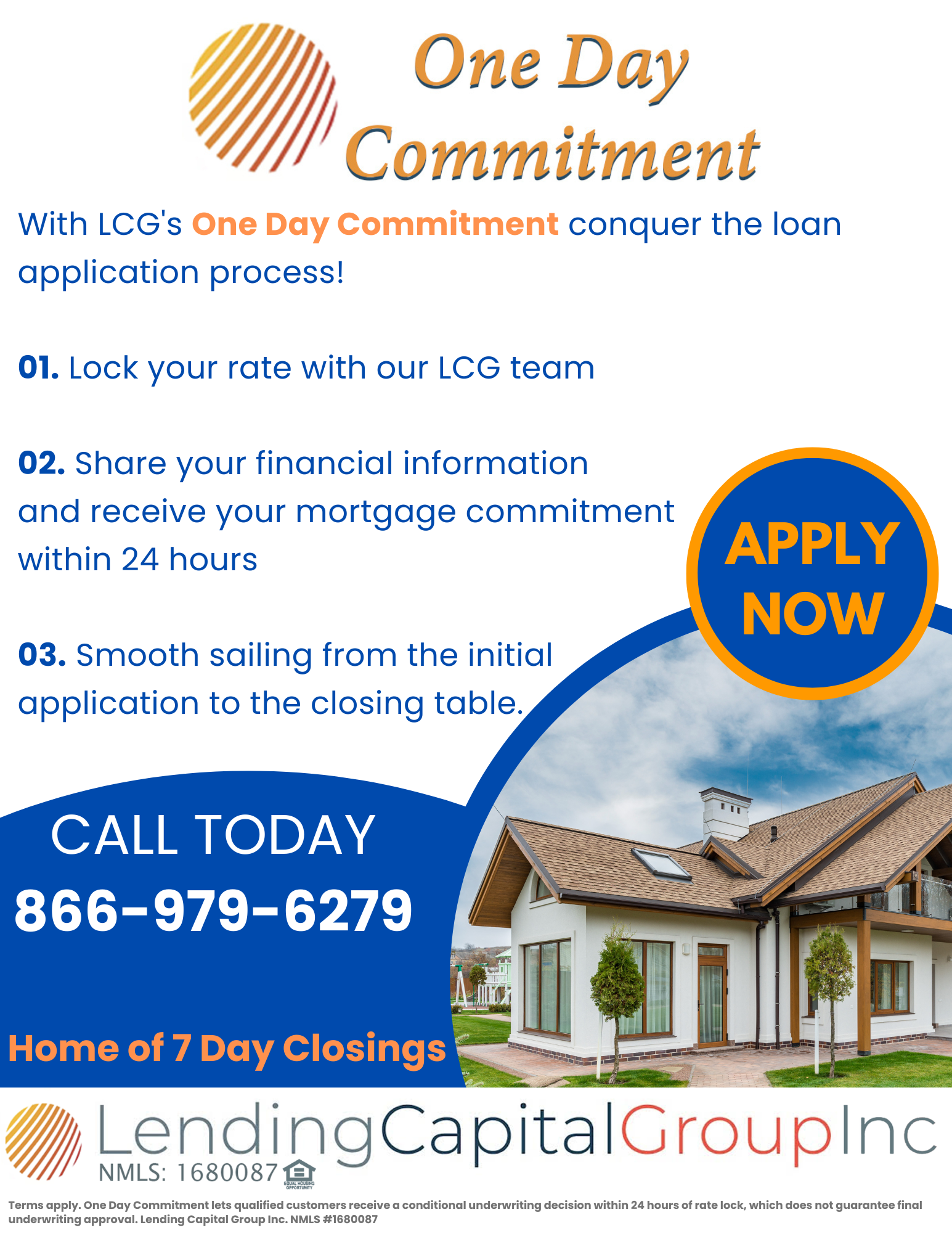 With the One Day Commitment, home buyers can lock in their rate and receive a commitment within 24 hours. This means that they can go into an open house, home tour, or talk with a realtor ready to buy, making it more likely they'll get the house they want.