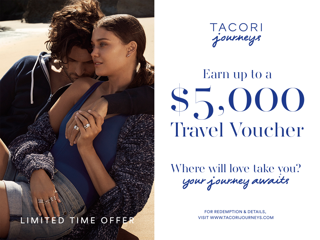 As part of their Tacori Travel Vouchers offer, Lewis Jewelers’ guests who purchase select 18-karat gold Tacori bridal or fine jewelry items will receive a travel voucher worth anywhere from $1,000 up to $5,000, which can be applied towards hotel stays in destinations throughout the world. (Certain exclusions apply. Please see store for details on qualifying purchases.)