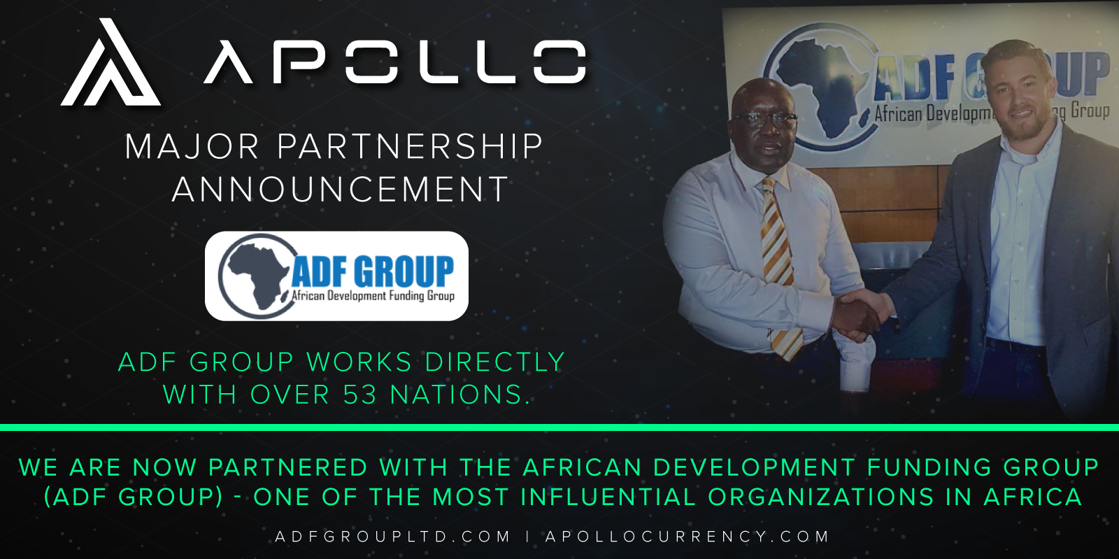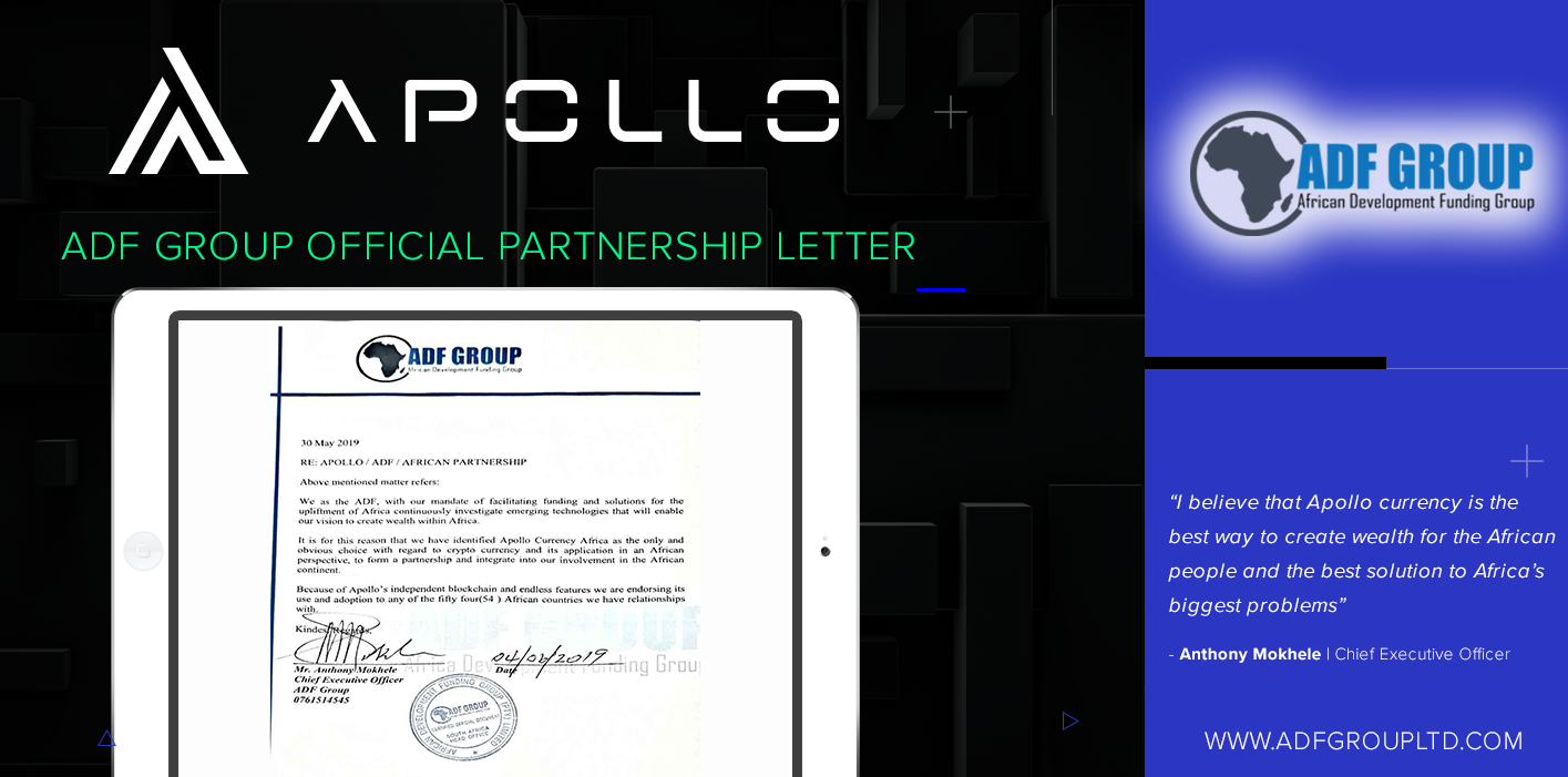 JOHANNESBURG, June 13, 2019 (Newswire.com) - Today Apollo Currency announces a historic partnership with African Development Funding Group (ADF Group) to encourage the use and adoption of cryptocurrency at a national level across the continent of Africa.