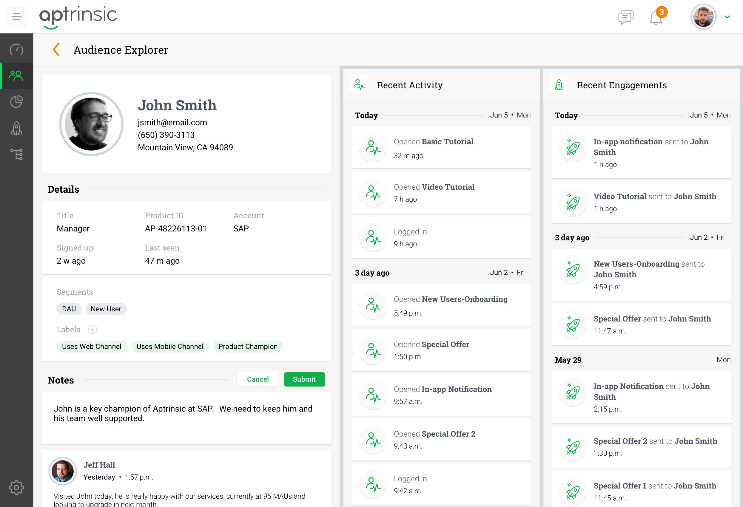 Aptrinsic provides SaaS companies with all three of these mission-critical elements: user, account, and product behavioral data, coupled with the capabilities to leverage this data into real-time omnichannel engagements and the ability to experiment.