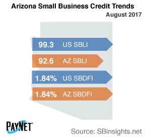 Coming in at 92.6, the PayNet Small Business Lending Index (SBLI) for Arizona increased 0.3% from the previous month's state level, but was 6.7% lower than this month's national SBLI level (99.3). The Index is basically unchanged from a year ago.