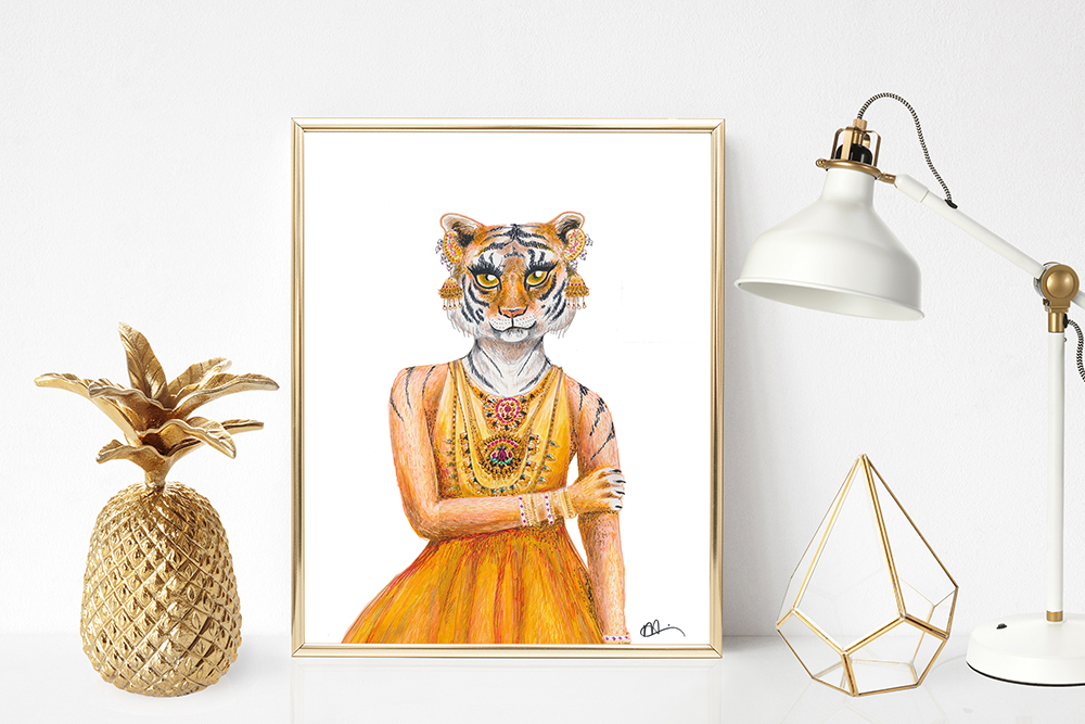 It's easy to see what she means. From an academic chimpanzee reading a newspaper to a tiger dressed in traditional South Asian jewelry to a spunky zebra sporting a mohawk, Mariam’s creations are stunning and suitable for any décor. Both adults and children will delight in the details of each drawing, such as the chimpanzee’s “Keep Calm and Eat a Banana” mug and the observant toucan’s “Guide to Humans.”