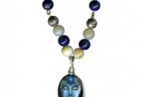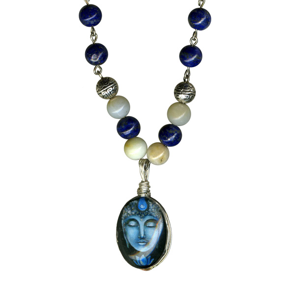 We then move unto the “Mantra Necklace Collection” by Sergio Olivos- these are Chakra Healing Crystal/Stone Necklaces each featuring mini archival reproductions of Claudia’s Namaste paintings encased in a glass pendant, delicately hand wrapped by Sergio in sterling silver and suspended from a Mala-inspired design of Healing Crystal Stones. These gorgeous healing stone mini painting necklaces are a unique and lovely statement piece with highly energized stones inspired aesthetically by the gorgeous meditative Mala/Rosary , they can be used for meditation and to inspire calm and peace. An unusual and beautiful necklace to showcase and empower your inner and outer beauty!