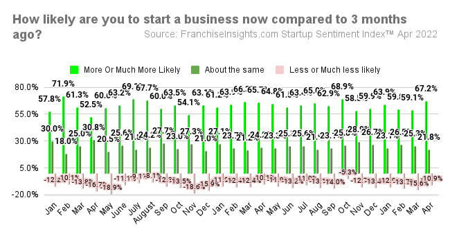 NORFOLK, Va., May 4, 2022 (Newswire.com) - April 2022 saw inflation at a 40-year high, war in Ukraine entering its third month, and the worst S&P 500 performance since March 2020. Despite all the uncertainty, 59.3% of aspiring business owners surveyed in April were resolute about starting their businesses within the coming three months. Not surprisingly, 77.1% of these survey respondents see business conditions about the same or getting better in the next three months. Currently, 69.2% of would-be entrepreneurs agree or strongly agree that "now is a good time to start a business", up from 67.7% in March, according to the Small Business Startup Sentiment Index™ by FranchiseInsights.com.