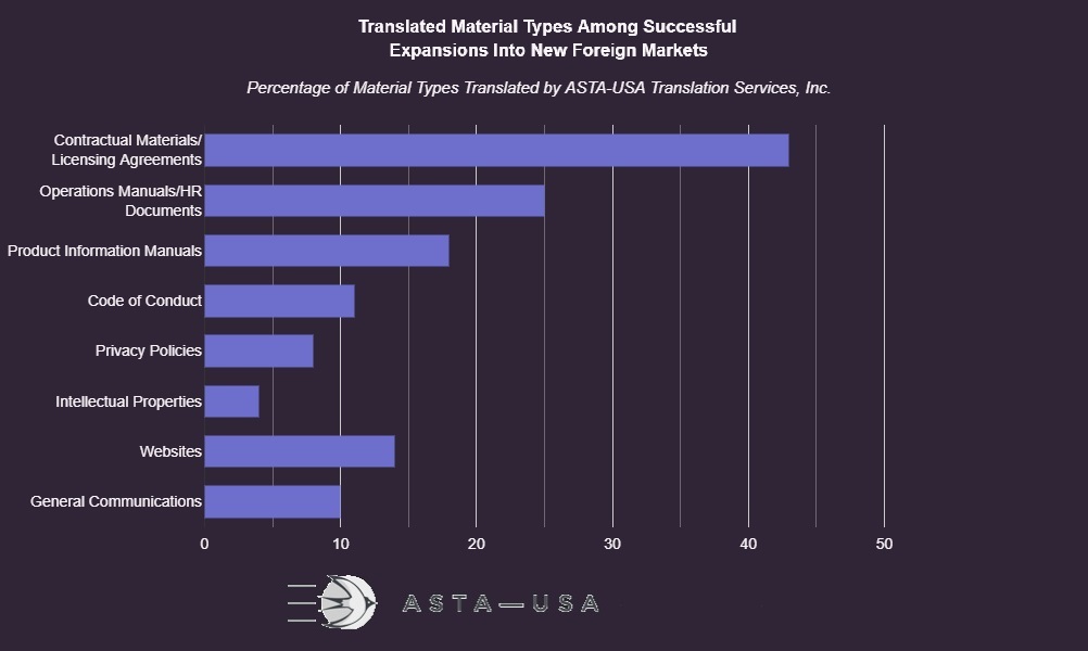 ASTA-USA's internal survey found that the most frequently translated documents were contractual materials and licensing agreements, making up 43 percent of the document types that ASTA-USA translates.