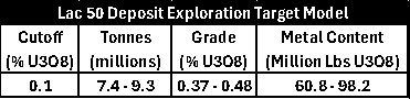 Table 1: Lac 50 Deposit Exploration Target Model