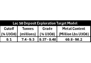 Surficial mapping was completed as part of the 2024 Angilak Exploration Program (the "Mapping Program"), which also included expansion-focused diamond drilling and geophysics. The Mapping Program has successfully achieved its objective by discovering high-grade uranium mineralization on surface beyond the extents of the Lac 50 Deposit's exploration target model (the "Exploration Target Model"), as defined in the updated 2024 Technical Report in accordance with the guidelines set forth in the National Instrument NI 43-101. The Technical Report establishes a baseline exploration target for the Lac 50 Deposit ranging between 60.8M lbs U3O8 and 98.2M lbs U3O8, with an average grade range between 0.37% U3O8 and 0.48% U3O8 (the "Exploration Target") (Table 1) and is notably restricted to drill results from the Lac 48, 50, 52, and 54 mineralized trends (the "Lac 50 Deposit") (Figures 2a & 2b).