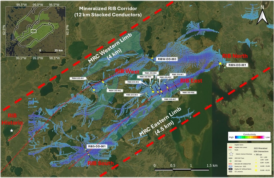 Cliff Revering, VP Exploration added: "We continue to see compelling evidence of the immense potential within the RIB regional target area. Our team has now discovered uranium mineralization across a 12 km graphitic structural corridor, and the results from the first RIB North drillhole, located over 1.4 km away from the nearest drilling, demonstrate impressive scale and continuity. These results highlight how our technical team is successfully translating a robust targeting strategy into meaningful new discoveries and set us up for a very exciting year ahead. Our thesis that the Angikuni Basin is an emerging new uranium district with substantial scale potential is steadily being validated."