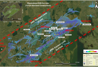 The MRC is now defined by over 12 km of stacked conductors based on the EM Inversion Model (Figure 2). The eastern limb of the MRC now has mineralization traced over a potential 4.4 km strike length, extending from RIB South, across RIB East to RIB North. Mineralization along the parallel, western limb of the MRC, extends from the Historic RIB Discovery through to the RIB West Discovery, tracing mineralization over a potential 4.0 km strike length. Outside of the currently defined discoveries, the MRC remains open and prospective for additional discoveries across the entire 12 km MRC.