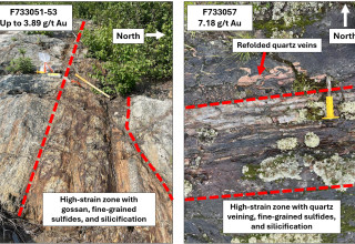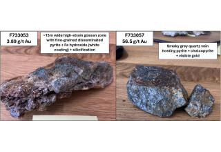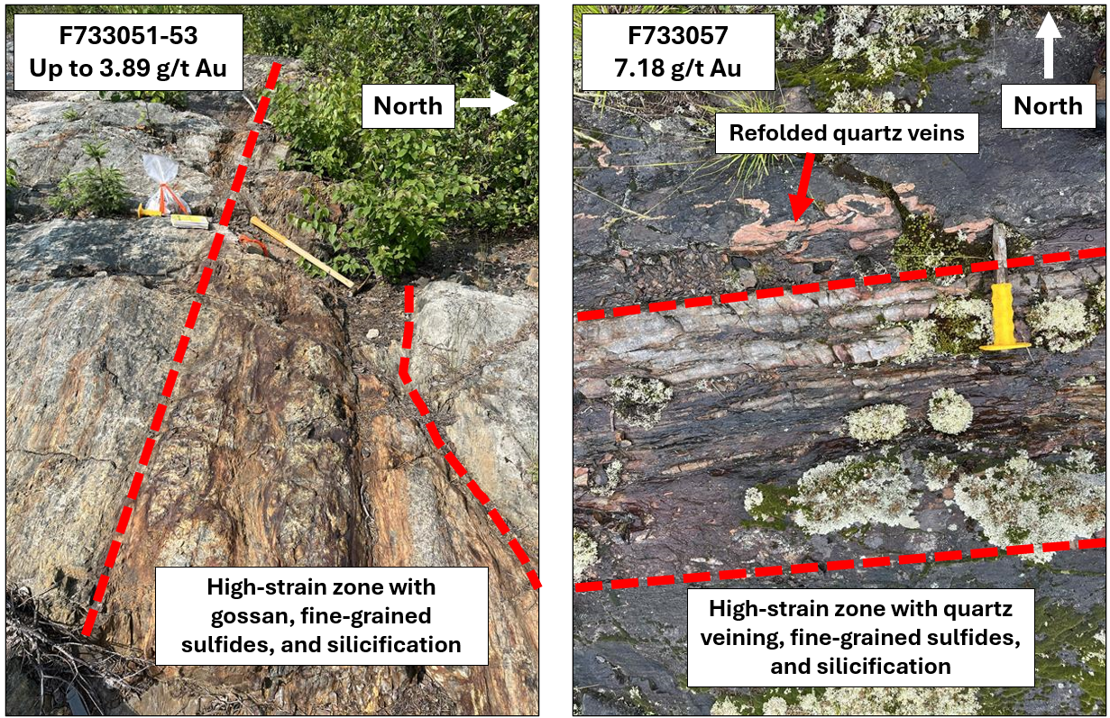 A sample of smoky quartz vein hosted in Balmer Assemblage volcanic rock containing blebby pyrite, chalcopyrite, and visible gold returned (F733057). This sample was taken approximately 50 m north of the contact with the Confederation Assemblage and was the most western sample collected. Two additional samples of gossaned and silicified volcanic host rock collected adjacent to the high-grade quartz vein returned 1.47 g/t Au and 2.40 g/t Au (F733056 and F733058, respectively).
