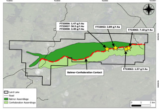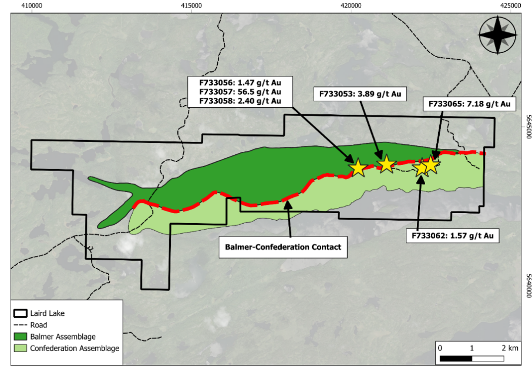 An initial six surface grab samples taken at the Laird Lake project in July 2024 confirmed mineralization over 2.2 km of strike length along the contact between the Balmer and Confederation Assemblages (Figure 1). Mineralization is open along strike to the east and west.