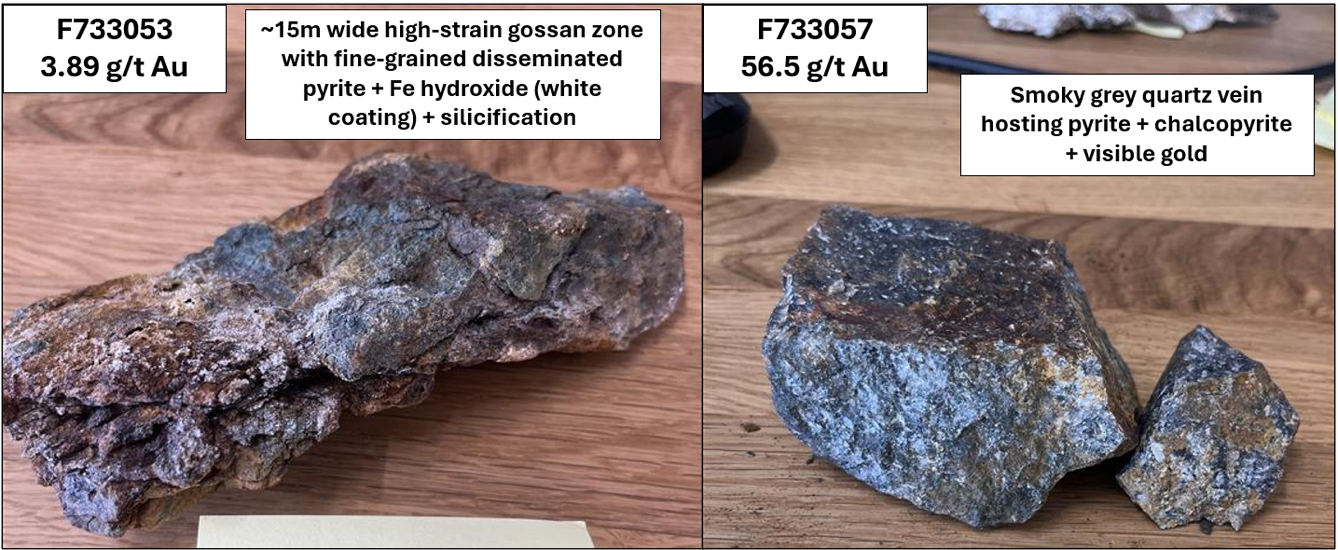 The highest-grade sample returned up to collected from a smoky quartz vein with blebby pyrite, chalcopyrite, and traces of visible gold (Figure 3).
