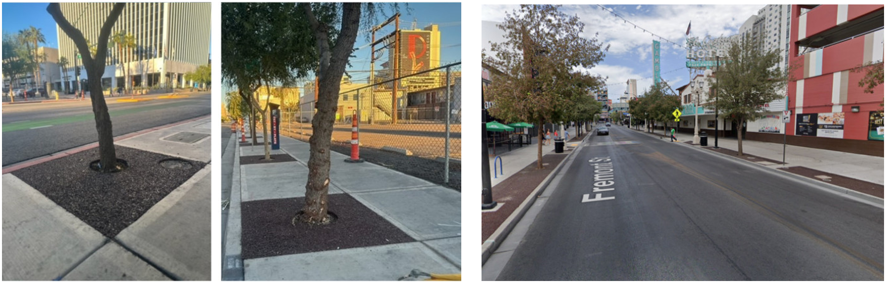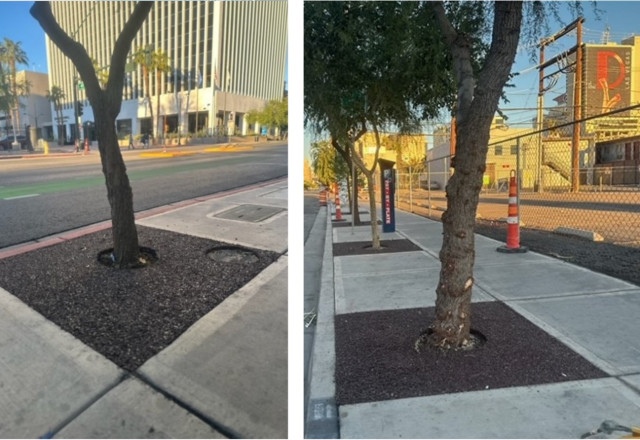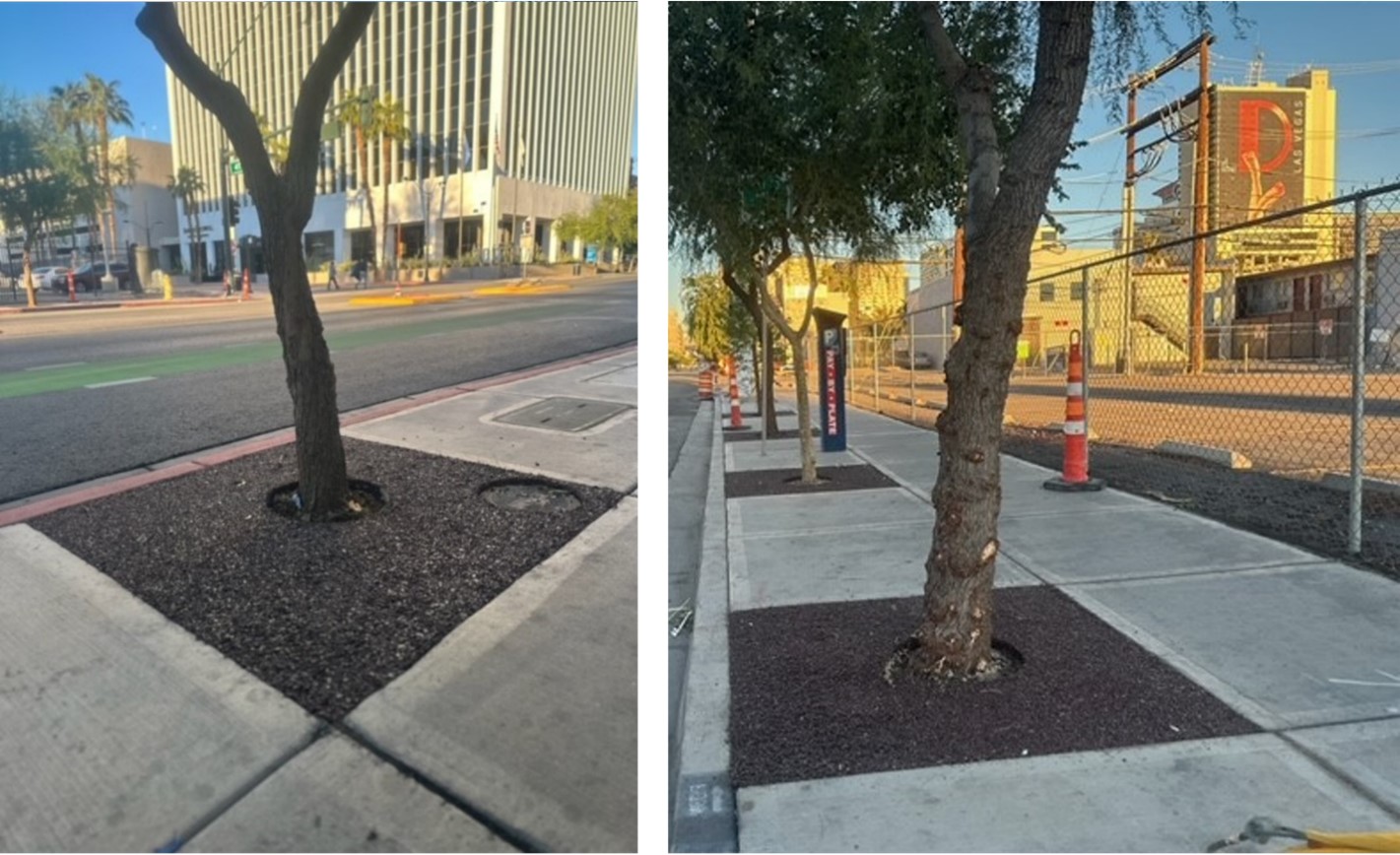 The City of Las Vegas has enjoyed not only the beauty of the tree surrounds over this last year but also their cost-efficiency and risk mitigating factors. CEO and Chairman, Kevin Bagnall, stated, "The tree roots will always search for moisture and air. Flexi®-Pave allows the water to go down, and the air is there within the 23% dynamic pore space in the Flexi®-Pave material." He continued, "The tree root will grow downwards as nature intended as opposed to the tree root searching for moisture that naturally exists beneath the impervious concrete or asphalt which ultimately results in the cracking sidewalk through tree root intrusion."