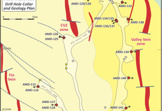 The programme continued to return significant polymetallic mineralised intersections from the Fin Vein, carrying notably high grades of silver, including 6.64 g/t Au, 135 g/t Ag, 8.15 g/t gold equivalent ("AuEq", calculated using Au and Ag only, with a Au:Ag ratio of 90), 0.45% Cu, 0.39% Pb and 4.85% Zn over a 3.75m interval, from 55.85m downhole depth, from hole AMD-117; 3.70 g/t Au, 113 g/t Ag, 4.95 g/t AuEq, 0.30% Cu, 0.10% Pb and 2.47% Zn over a 5.90m interval, from 83.60m downhole depth (hole AMD-118); and 3.34 g/t Au, 182 g/t Ag, 5.37 g/t AuEq, 0.39% Cu, 0.23% Pb and 5.54% Zn over a 4.00m interval, from 75.50m downhole depth (hole AMD-120). Please refer to the news release dated November 7, 2024 for further details about the Fin Vein.