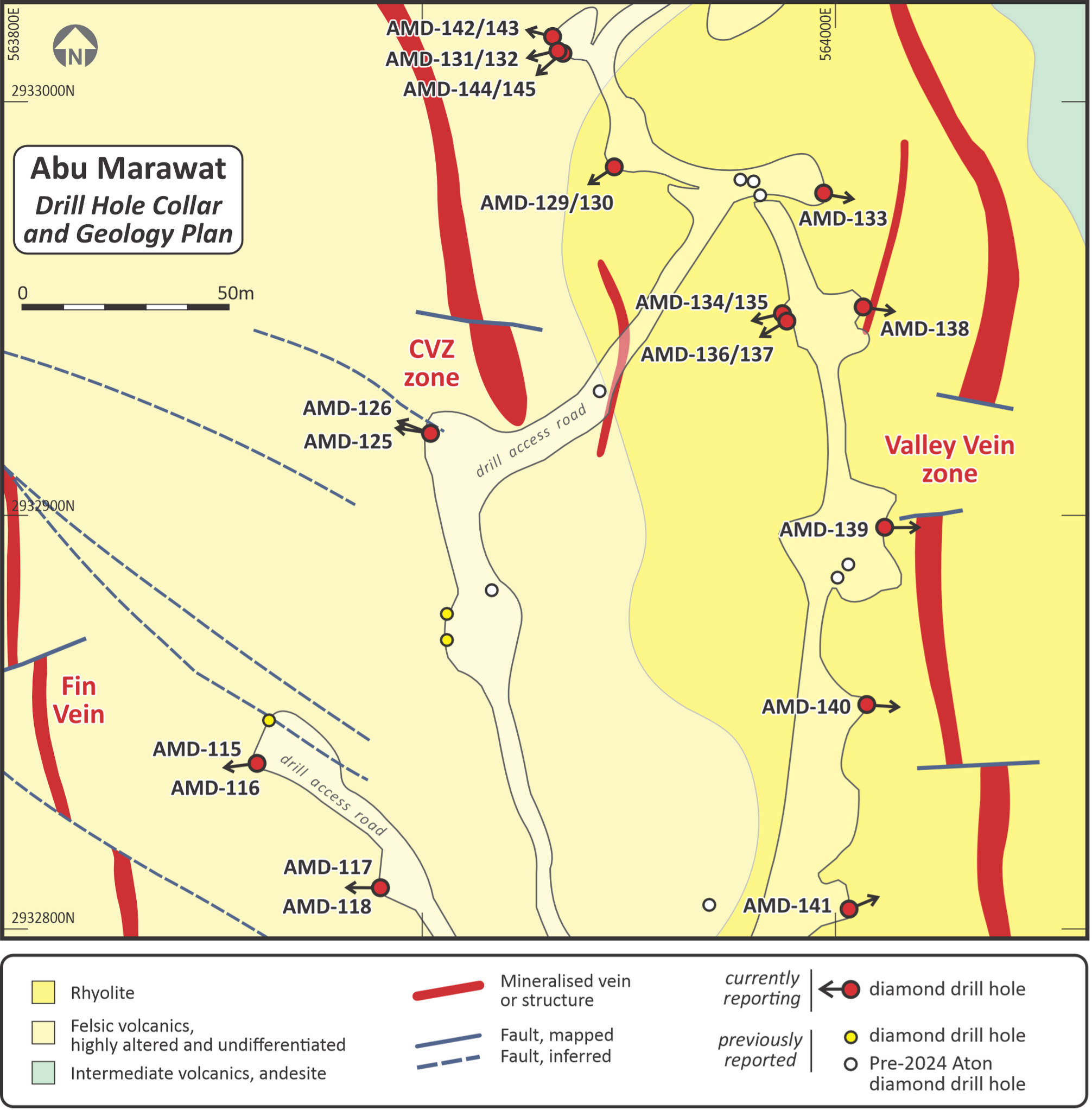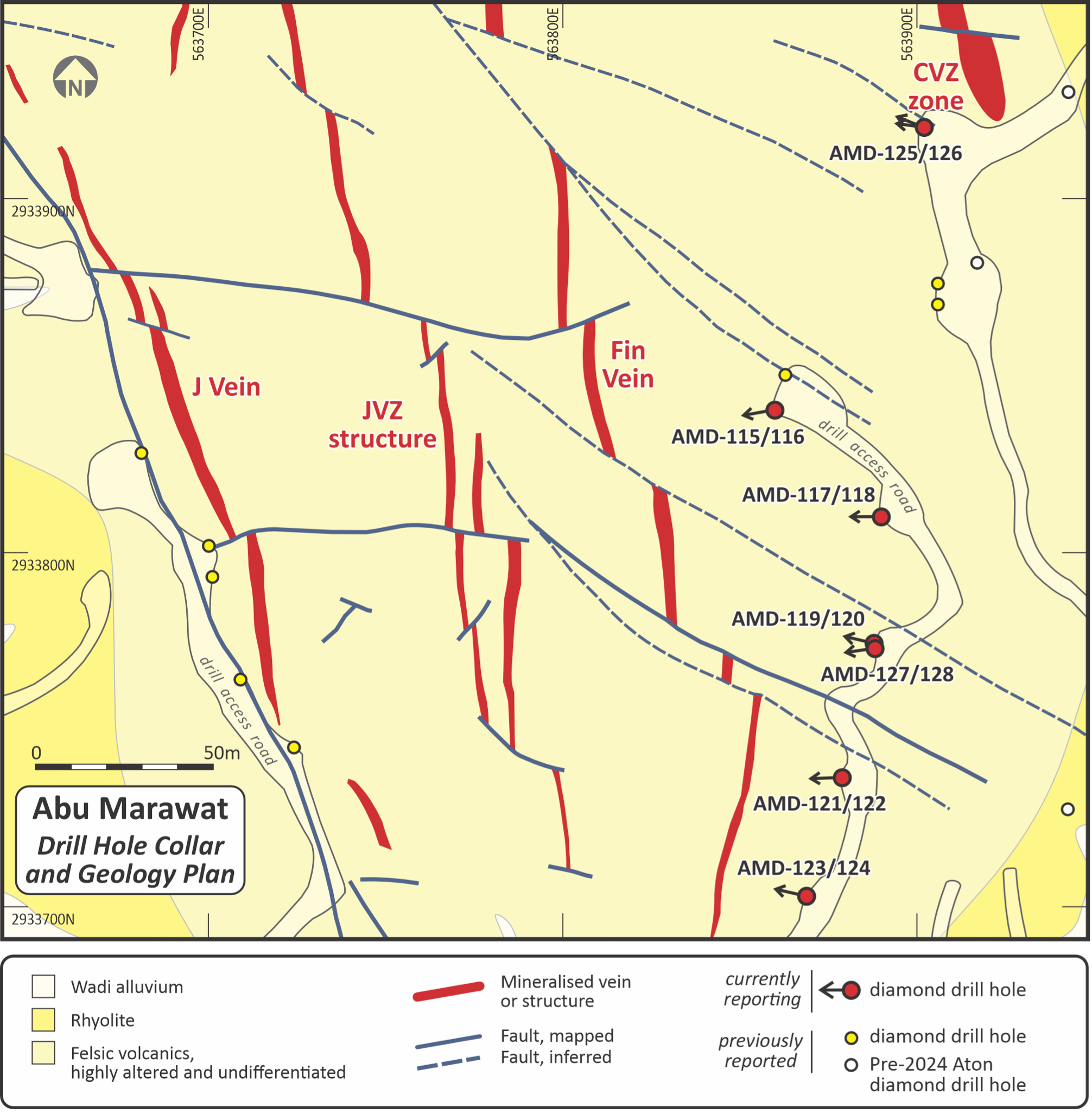The polymetallic mineralisation at Abu Marawat is interpreted as being mesothermal in origin, and occurs in a series of discrete and roughly parallel N-S to NNW-SSE trending veins and structures, of which the Fin Vein and the Central Vein zone ("CVZ") are the most significant, hosted within a sequence of intensely hydrothermally altered, felsic metavolcanic rocks (Figure 2). The Fin Vein and the CVZ are about 50-100m apart and have been traced for at least 800m in surface outcrop and drill holes. Aton's previous drilling has demonstrated that these structures extend to at least 200m in depth.